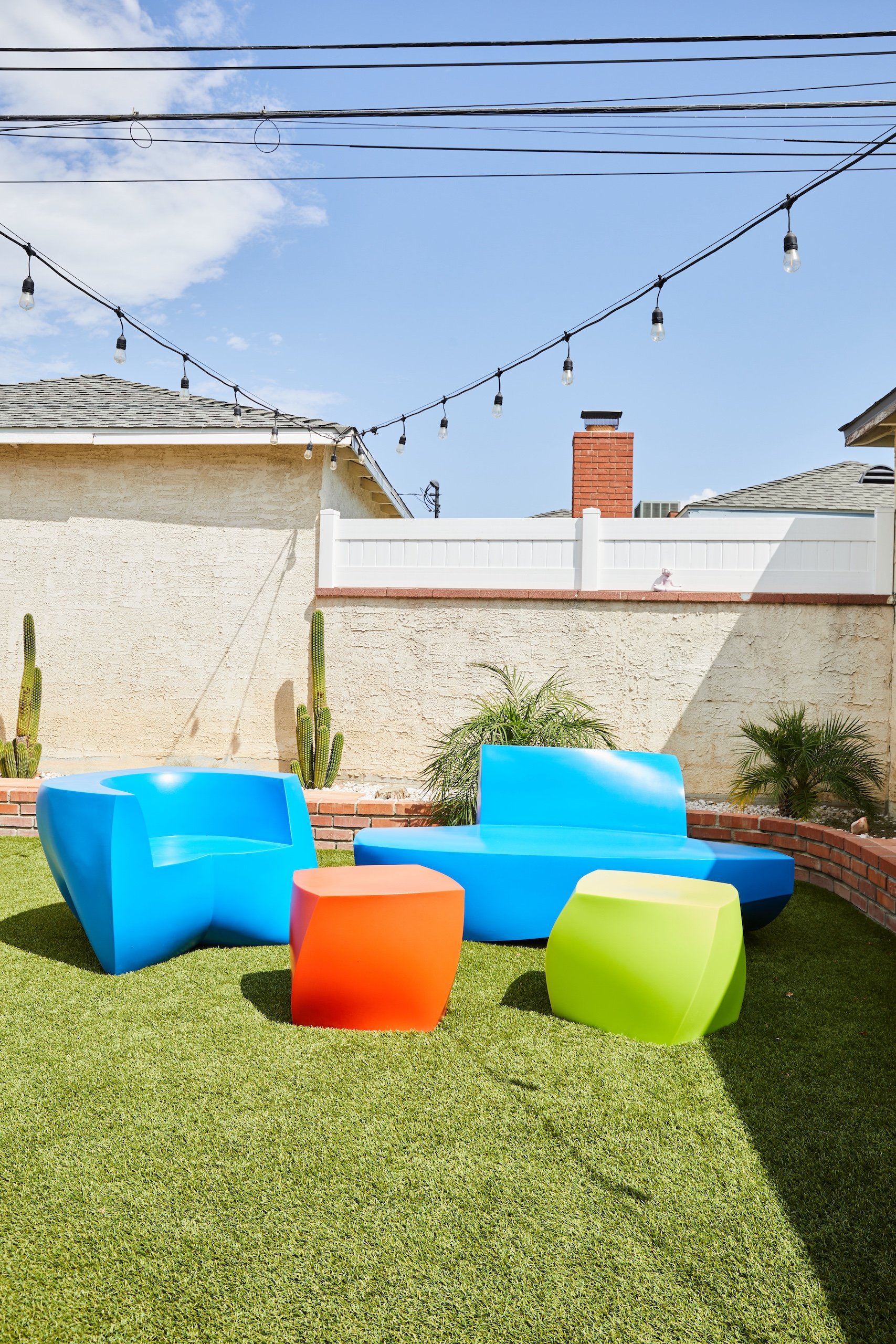 On fun functionality: I love Heller furniture, and we have some in the house. The outdoor set helps create a nice flow from inside to outside. Plus, it’s easy — we didn’t want anything we’d have to cover up or reassemble every time we used it. It looks like a big LEGO set.