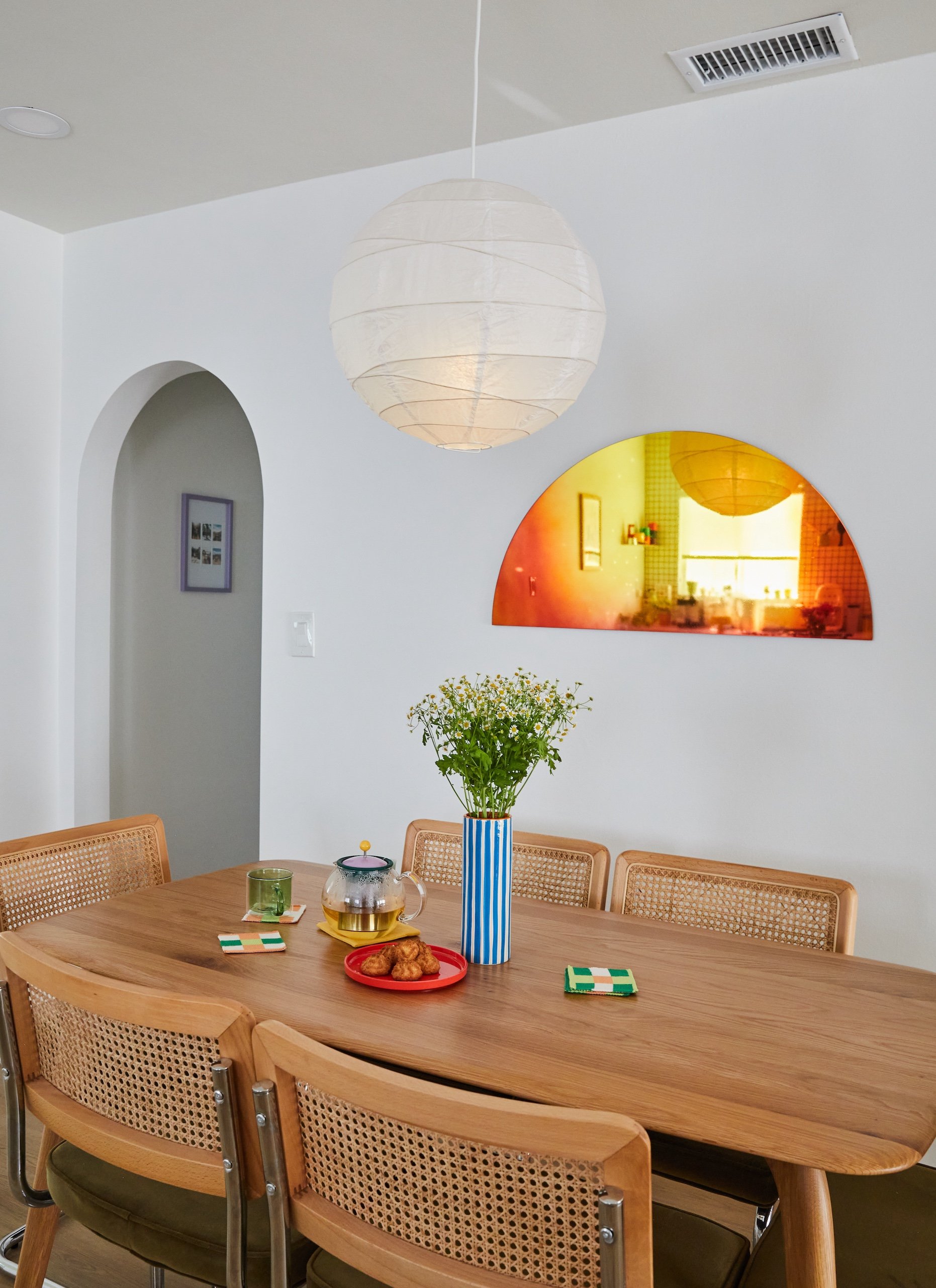 Hanging light fixture: Ikea. Table: Castlery. Chairs: Castlery, similar. Mirror: Urban Outfitters. Vase: &Klevering.