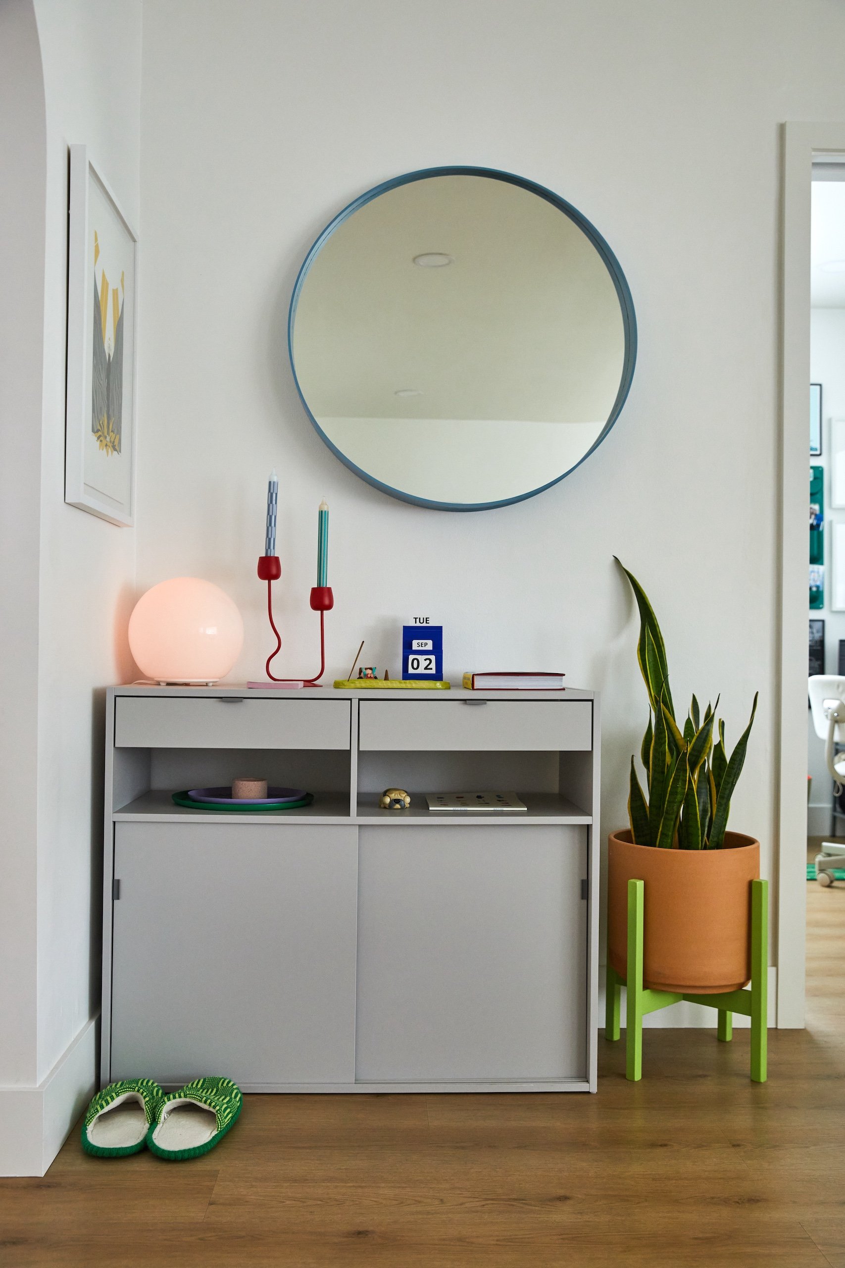 Mirror: Ikea (“I painted it blue”). Console table: Ikea. Lamp: Ikea. Candleholder: Ikea. Candles: Hay, similar. Calendar: Karst Goods, similar.