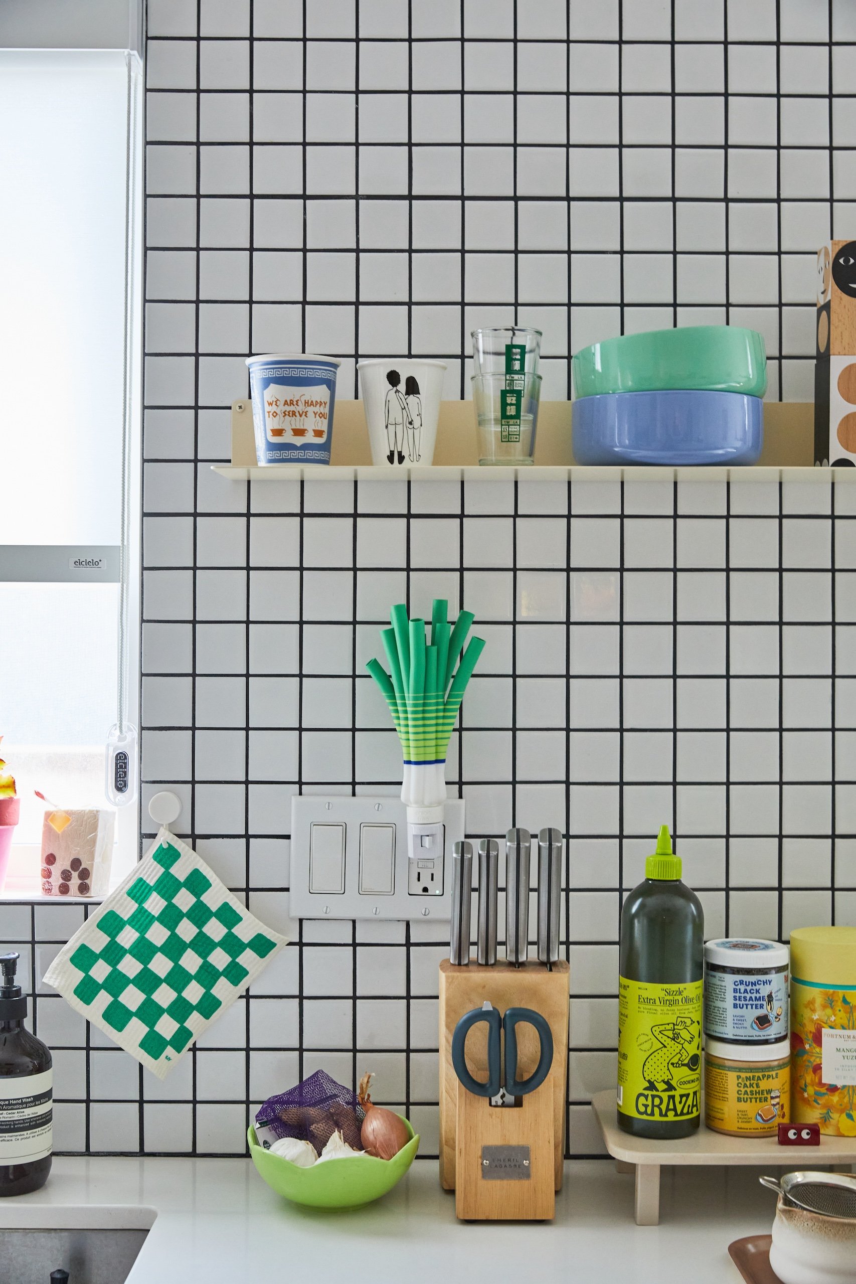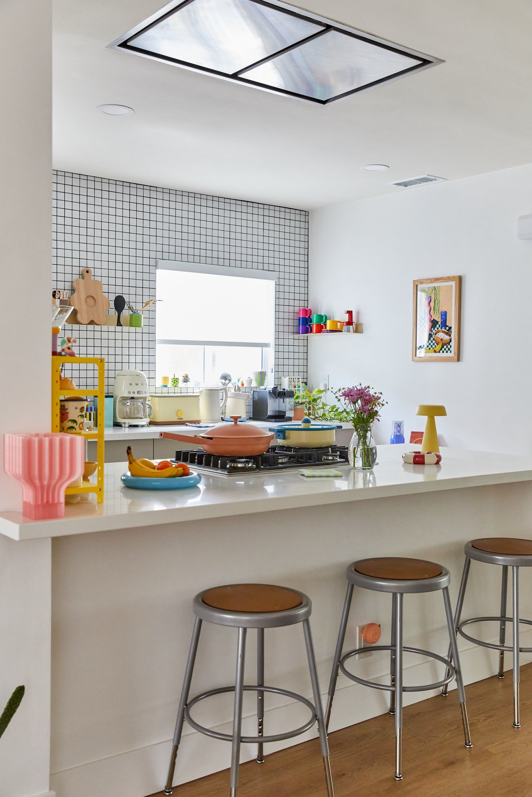 Bar stools: vintage, similar. Fruit plate: Gustaf Westman. Pink lamp: Oblique Method. Yellow lamp: Aleo. Countertop shelf: MoMA Design Store. Mug set: Heller.