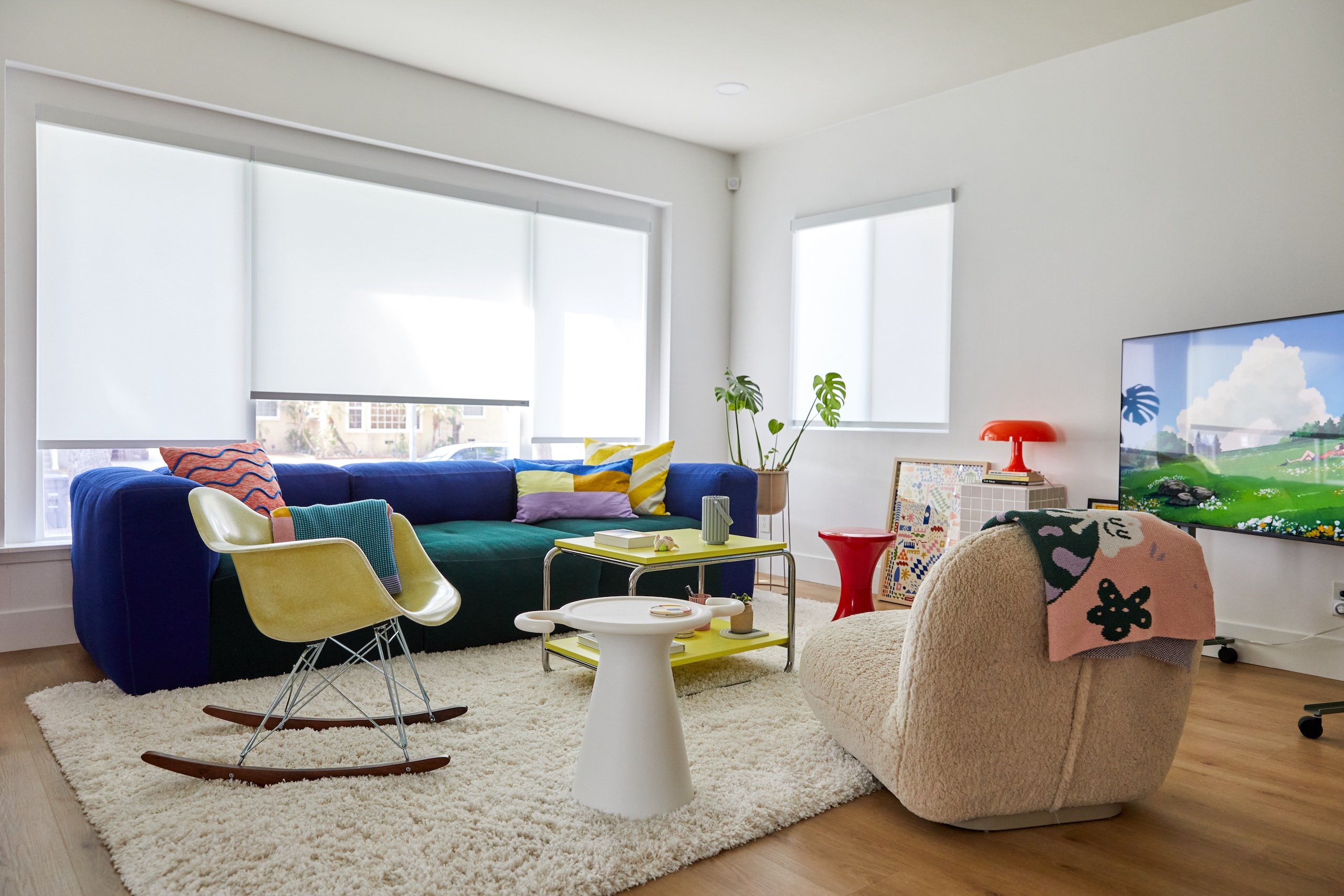Sofa: Hay. Throw pillow: Verloop, similar. Rug: Ikea. Coffee table: Ikea. Lounge chair: Valyou. Blanket on chair: Slowdown Studio, similar. Rocker: Downtown Modernism, similar. Side table: Heller. Red stool: MoMA Design Store. Table lamp: MoMA Design Store.