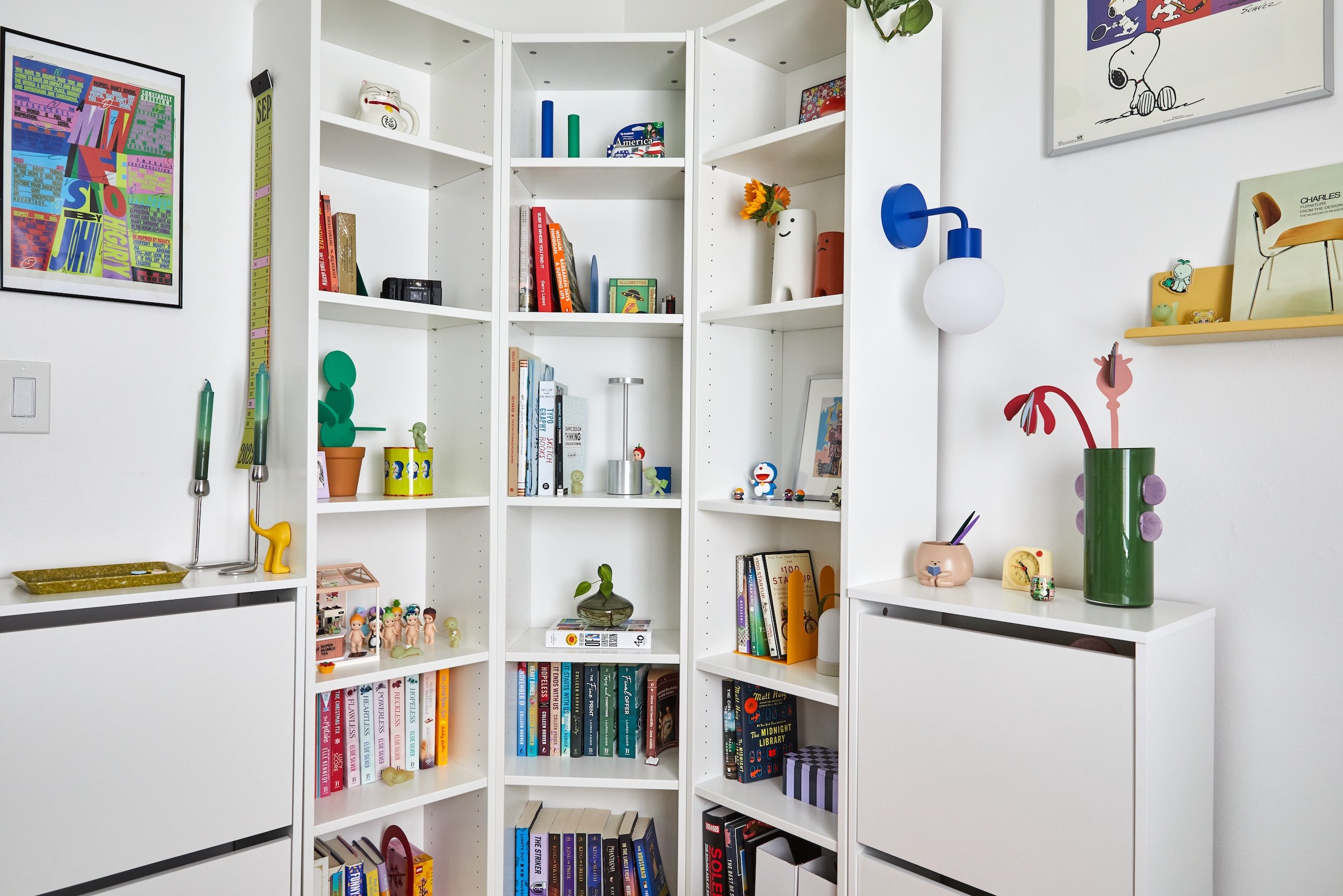 Bookshelf: Ikea. Sconce: Poplight. Smiley vases: Ikea. Cabinets: Ikea. Green vase: Aescraft.