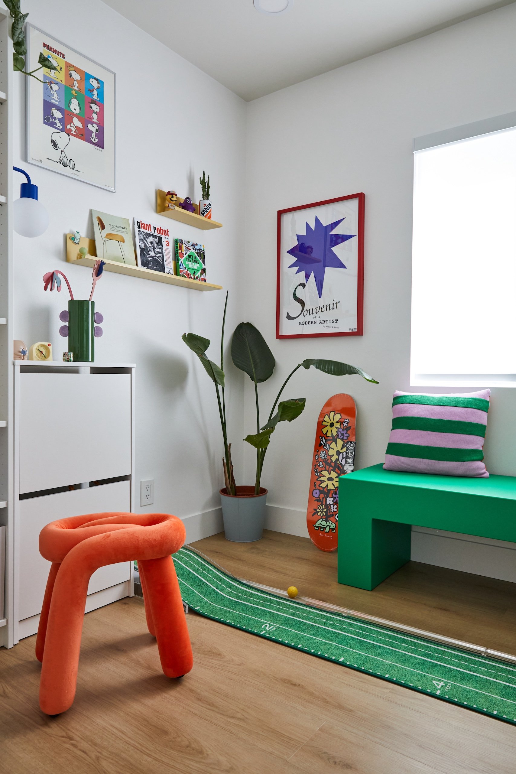 Bench: Heller. Throw pillow: Verloop, similar. Golf set: Amazon. Stool: Aescraft. Framed print: Tate Modern Museum.
