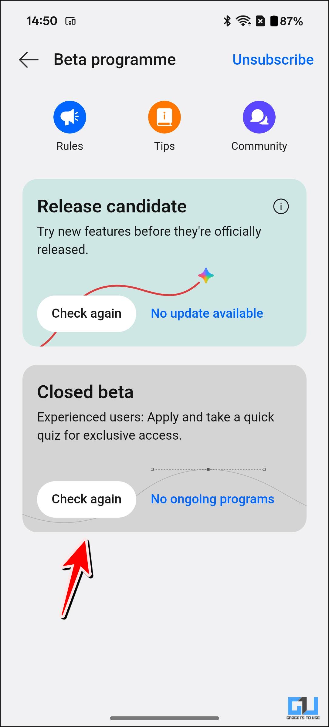 6. Finally, come back to the Software update menu and tap on Check again under the Closed beta banner.