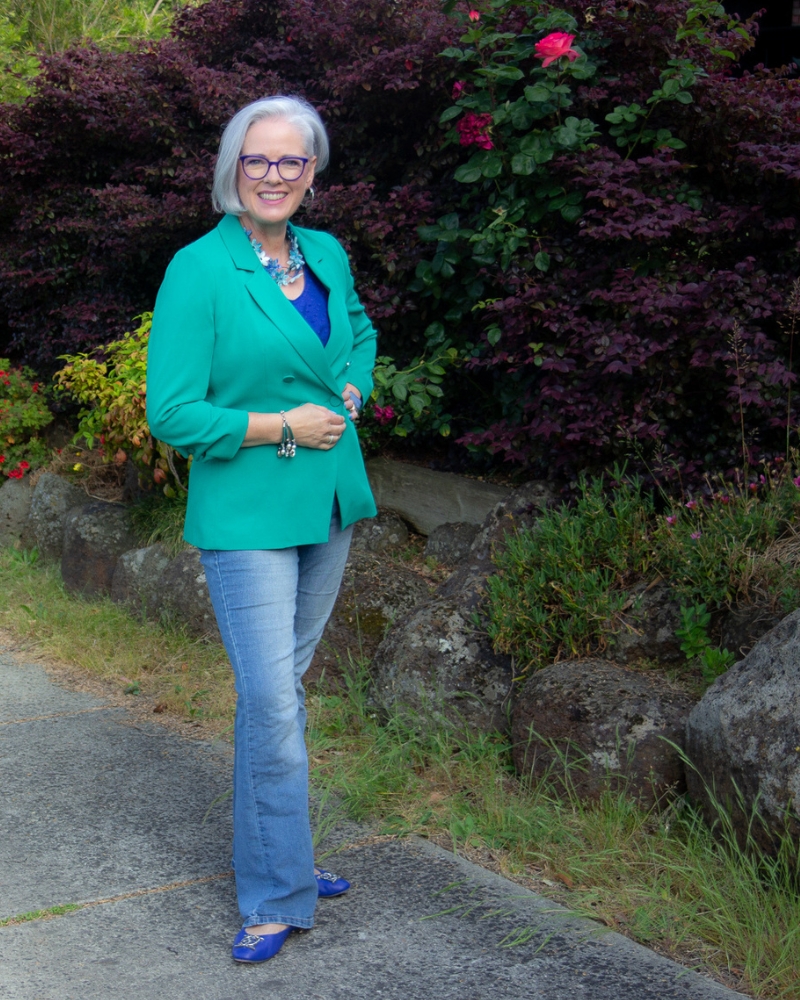 • An unlined jacket or soft cardigan instead of a fitted blazer.
