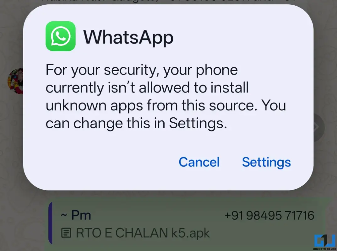Your phone will now block any attempt to install an app when you try to open an APK file received on WhatsApp. Here’s how it would look: