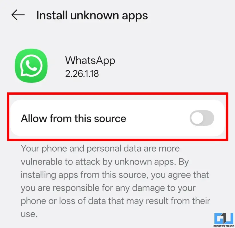 Even after staying cautious, it is possible to make a human error by unintentionally installing an APK file from WhatsApp in the flow of the moment. This leaves a significant risk of exposing yourself to hackers and scammers, for just making a simple mistake of installing an unknown app. But there’s no need to worry, as the Android OS provides an option to prevent it. Here’s how you can enable it: