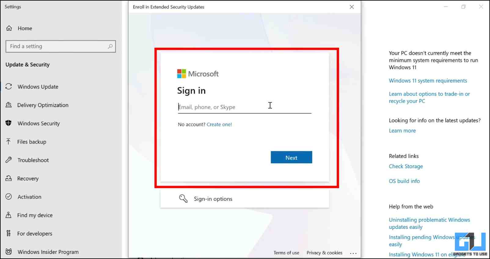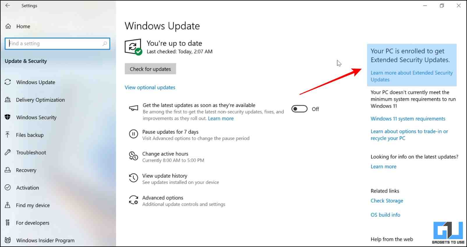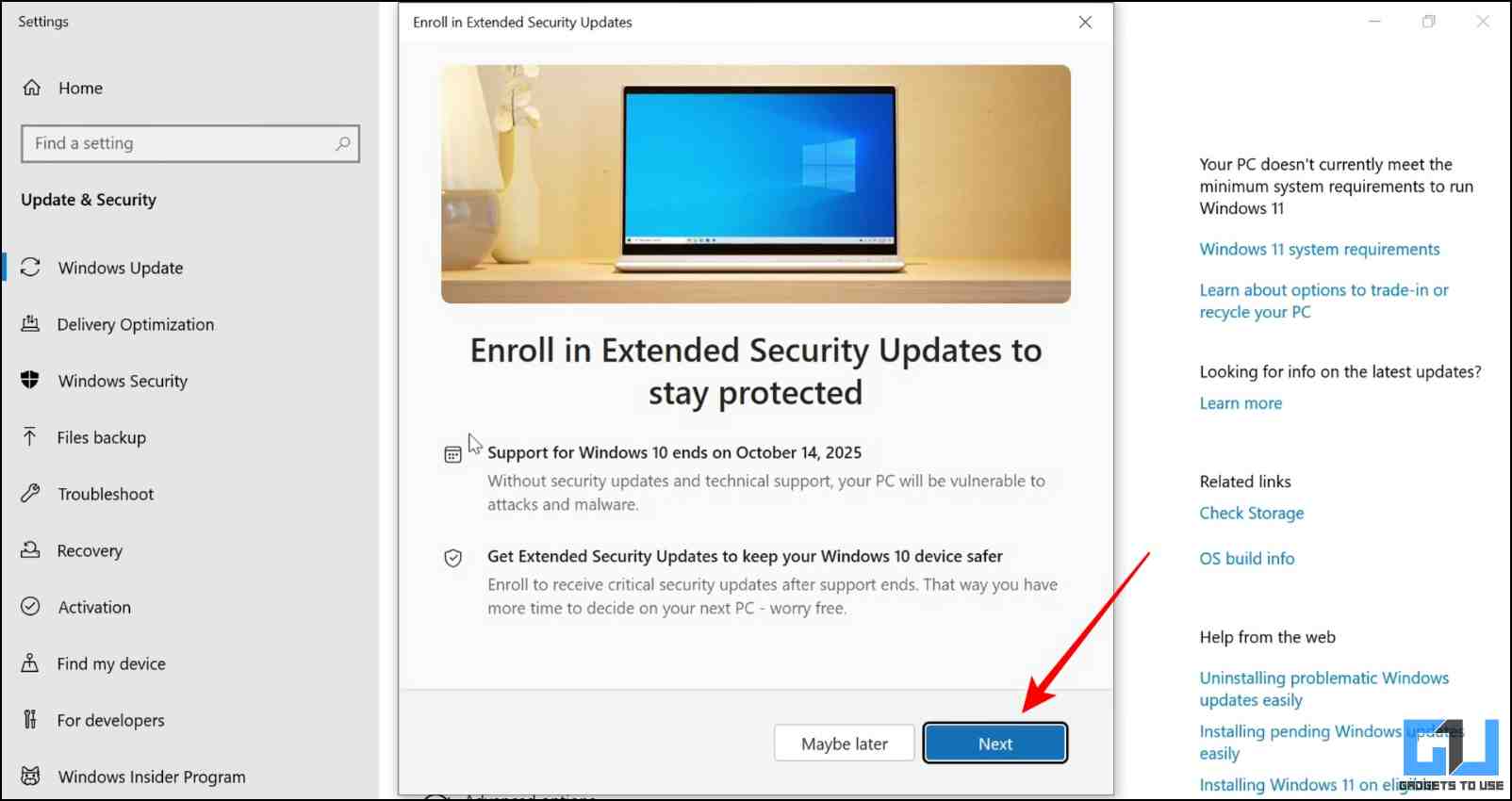 Open Settings > Click on Update & Security > Select Windows Update from the left sidebar > Look for the Enrol now option on the screen to register for Extended Security Updates.