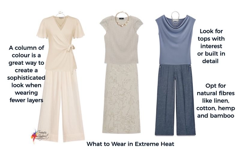 And when the heat is intense, lean on grooming and small accessories to elevate the look. A pair of earrings, tidy hair, or a swipe of lipstick can bring that feeling of polish without adding physical weight or warmth.