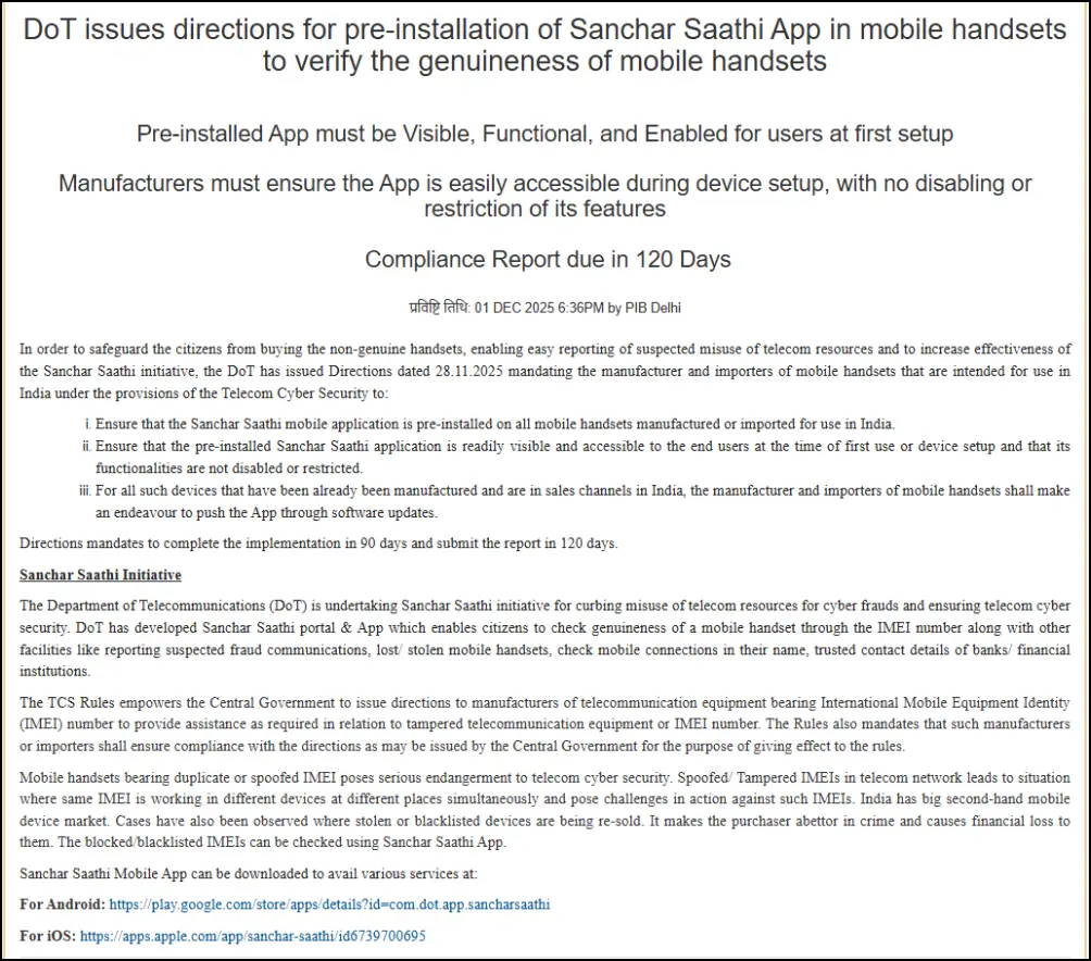 - Sanchar Saathi app to be pre-installed on all smartphones in India sold after March 2026.
