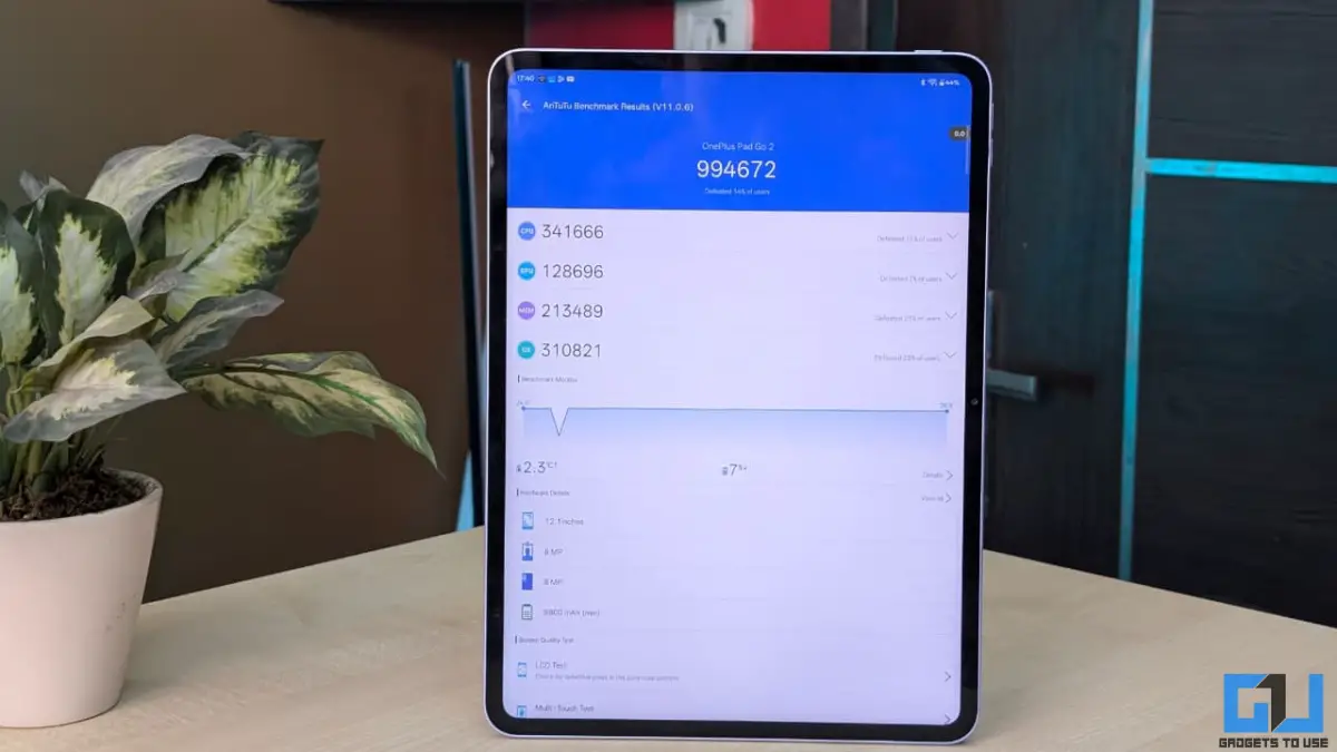 Powering the OnePlus Pad Go 2 is the MediaTek Dimensity 7300 chipset, paired with LPDDR5X RAM. On paper, the tablet posts an Antutu score close to 1 million, but more importantly, that performance translates well into real-world usage.