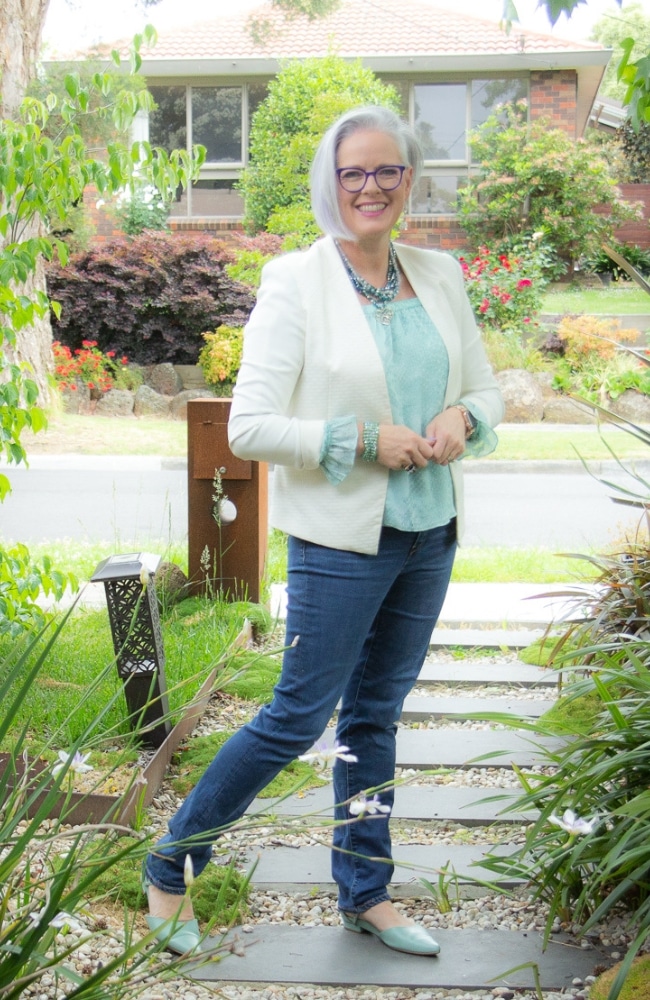 As I have silver white hair – light silver and grey are my go to neutral – and then I add a colour replicated multiple times, such as the pops of blue in my top, necklace, earrings and glasses below.